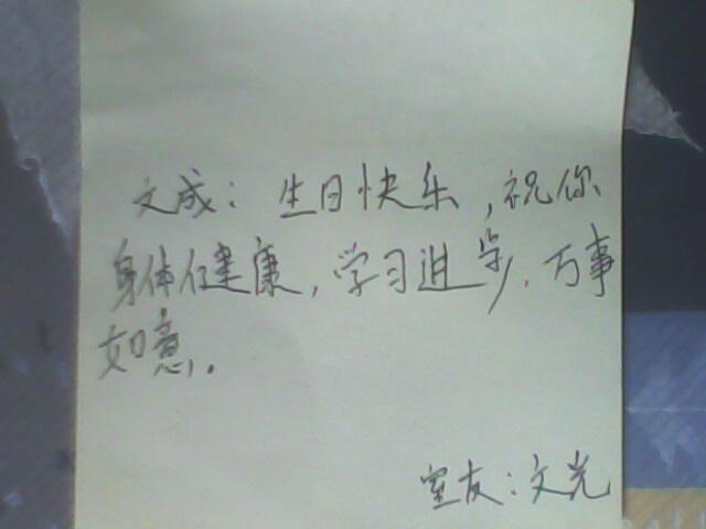 | From: Oeng Bunkoang (Cambodia)(indirectly translated) Joe: Happy birthday, I wish you good luck, good health, and excellence in your studies. Your roommate, 文光 (His name in Chinese) |